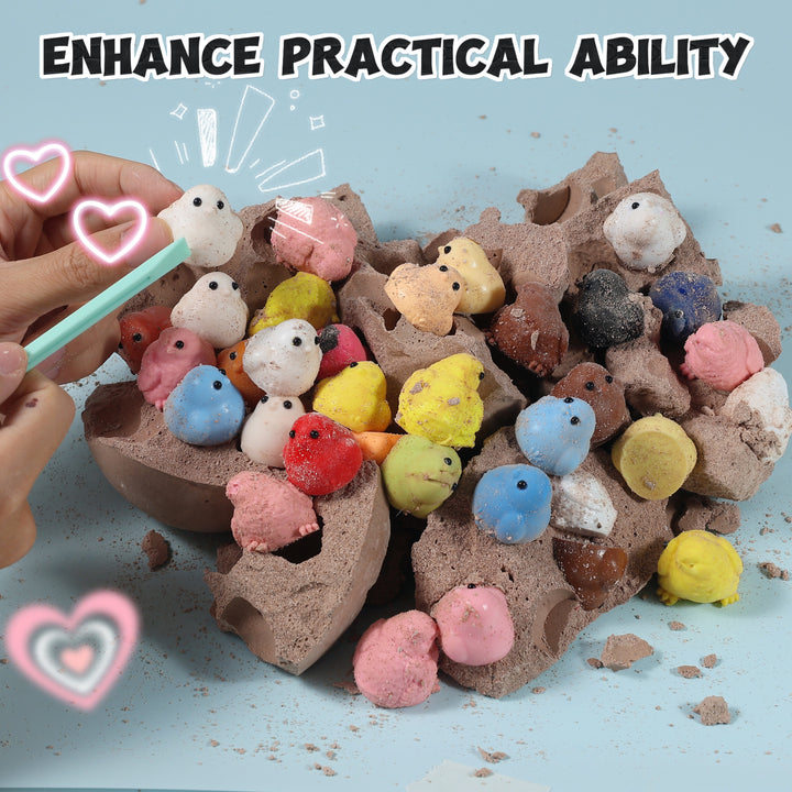 Get ready for an extra-large adventure! Hidden inside the giant clay block lies a Caramel Chicken Squishy, soft, glossy, and full of fun. Use your digging tools to chip, scrape, and reveal this adorable squishy friend — bigger, stretchier, and even more satisfying to squish! 💫
