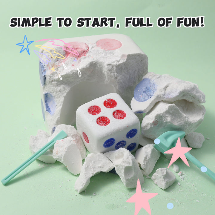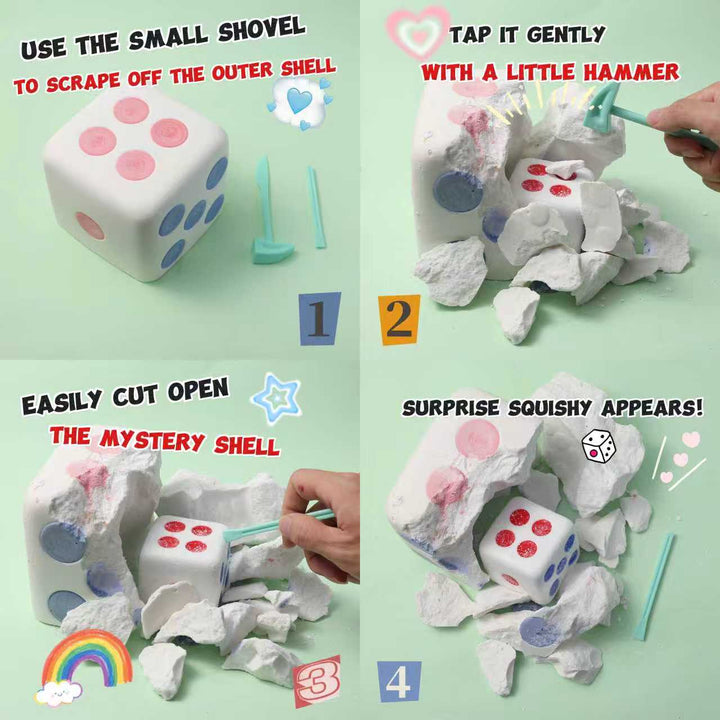 Ready to test your luck? Hidden inside the massive clay block lies a Giant Dice Squishy, waiting to be revealed! Use your digging tools to chip, scrape, and uncover this soft, jumbo-sized squishy cube — perfect for squeezing, collecting, or just rolling into endless fun! 💖✨