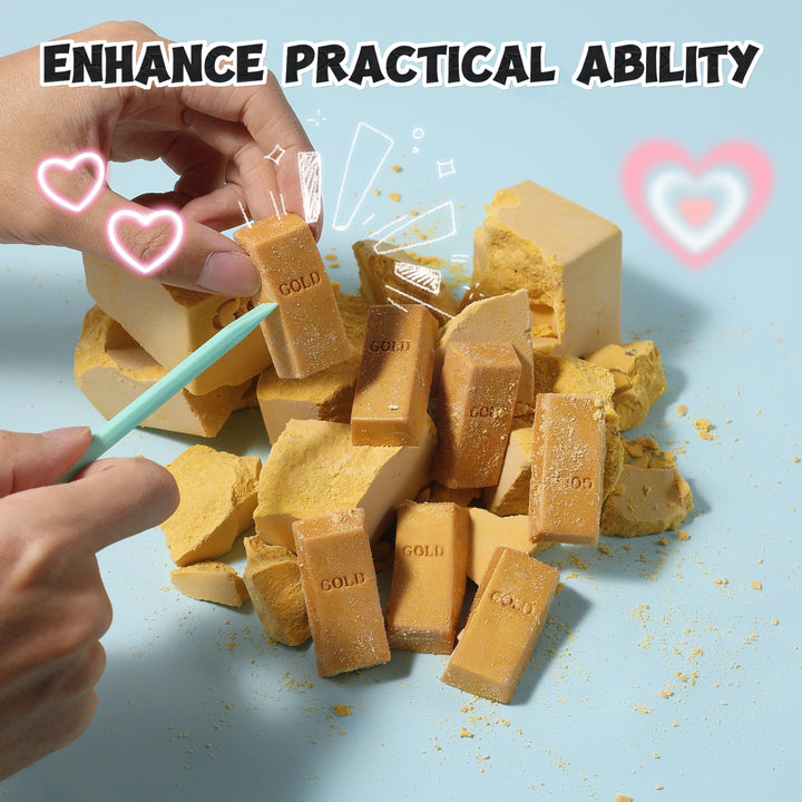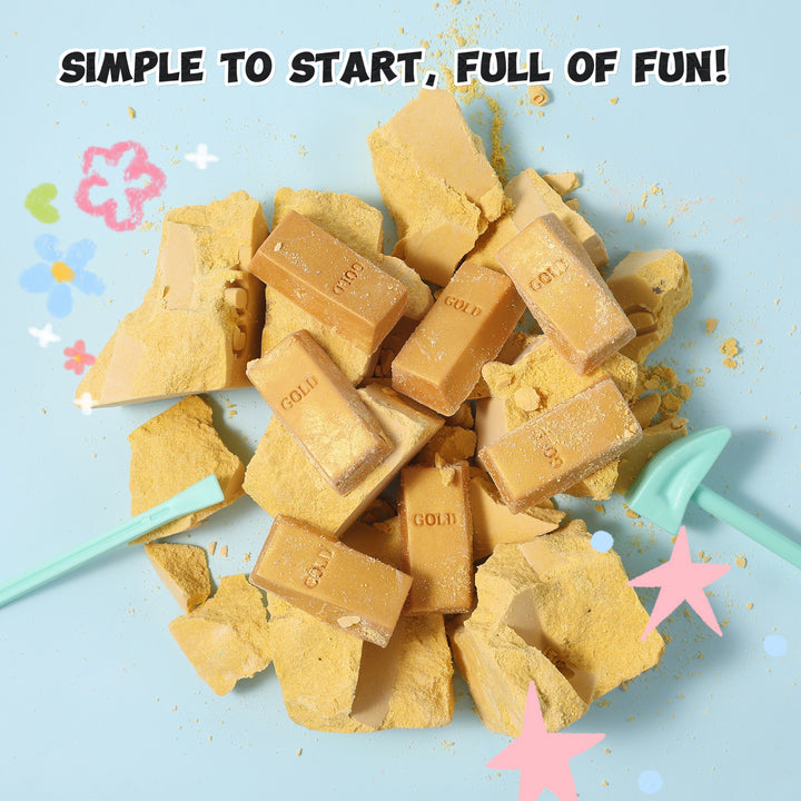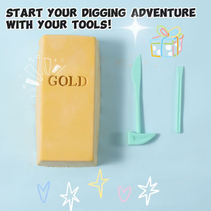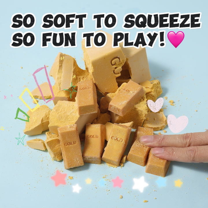 Get ready to dig for treasure! Hidden inside the giant gold block are 7 shiny mini gold brick squishies, waiting to be discovered. Chip away the clay, uncover each piece, and enjoy the most satisfying squishy surprise ever!